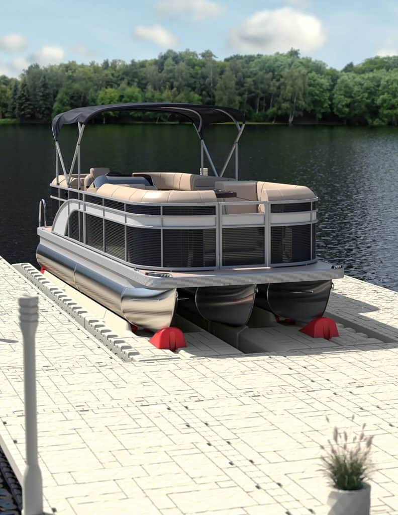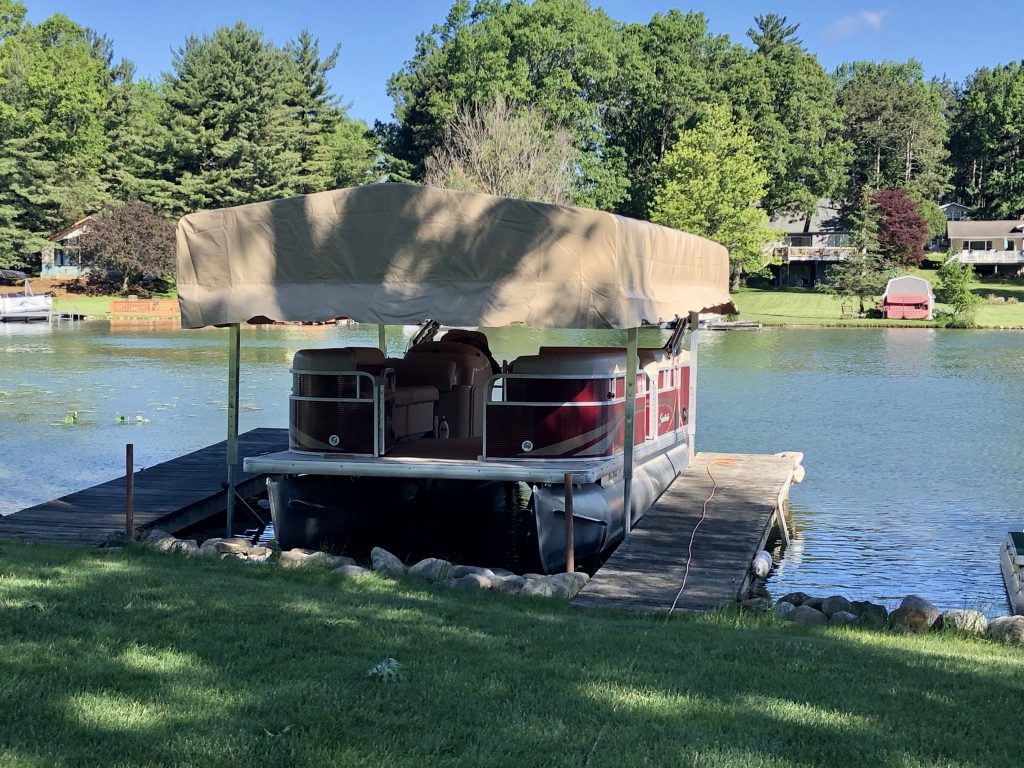 New to the market these Wave Armor branded floating pontoon or tritoon lifts work great in deep water and mucky conditions! Now available with canopies as well! The Wave Armor Pontoon Port is great for boats up to 25’ in length where a traditional lift won’t work due to water depth or bottom conditions. Available to be installed completely independent of any other docking system or connected to any other dock and or seawall. The Wave Armor floating Pontoon Port is a great way to protect your investment from the dirt and crud of the lake.