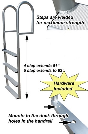 Choose from a 4 Step or 5 Step Welded Dock Ladder, the 4 Step extends 51″ and the 5 Step extends 63″